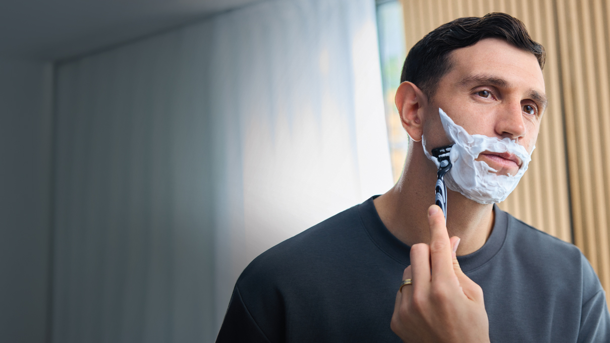 Mientras te afeitas, enjuaga tu rostro para limpiar el gel o la espuma de afeitar, y recuerda nunca golpear las hojas a los costados del lavabo ni secarla con una toalla. Movimientos como estos pueden dañar tu máquina de afeitar y causar más cortes.