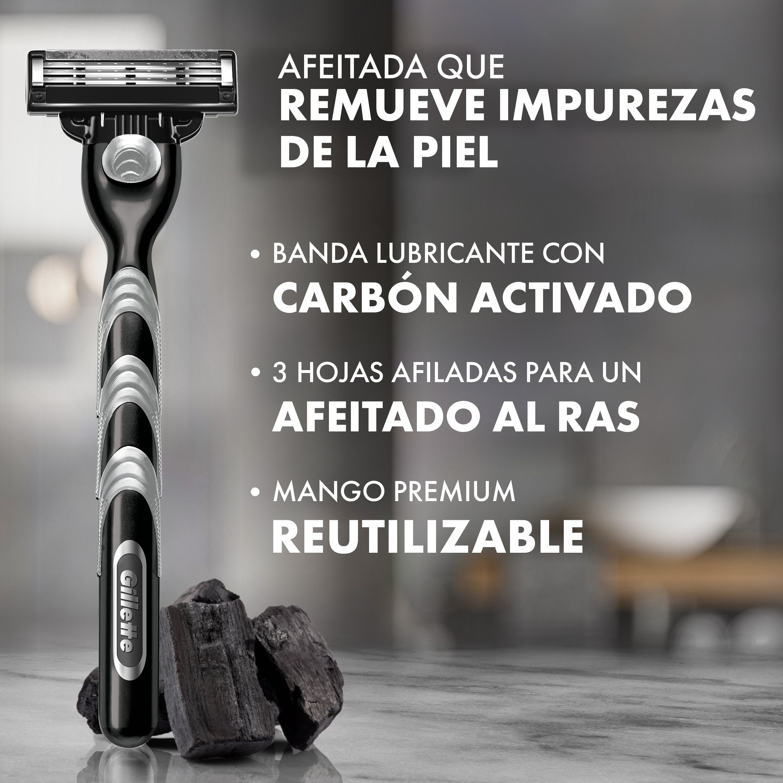 La nueva máquina de afeitar Gillette MACH3 Carbono tiene carbón activado en su banda lubricante.